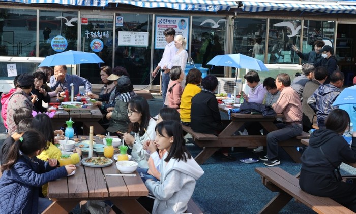 | ▲ 강진마량놀토수산시장을 찾은 관광객들의 모습이다. |