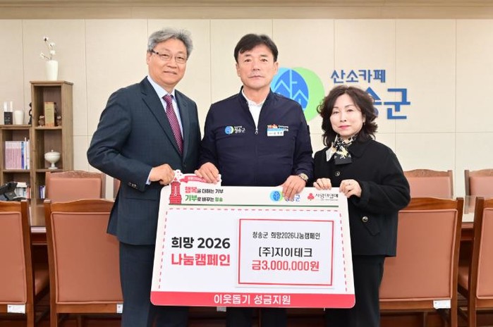 [파이낸셜경제=김지훈 기자] 청송군은 지난 22일 대구시에 소재한 하수도 기술진단 및 환경기술전문업체 ㈜지이테크가 이웃돕기 성금 300만 원을 기탁했다고 밝혔다.