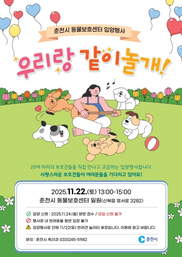 춘천시가 22일 오후 1시 춘천시 동물보호센터에서 유기견 입양행사 ‘우리랑 같이 놀개’를 연다. 이번 행사는 입양을 희망하는 시민이 보호견을 직접 만나보고 교감할 수 있도록 마련한 자리다.