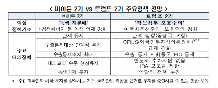 그는 바이든 대통령이 재선될 경우 청정에너지 확대 등 '녹색 재분배(Green Redistribution)' 정책이 핵심이 될 것이며, 주요 대외정책으로는 현행 관세 수준 유지, 수출통제대상 단계적 추가, 수출통제조치 확대 및 녹색투자의 확대가 예상된다고 분석했다.