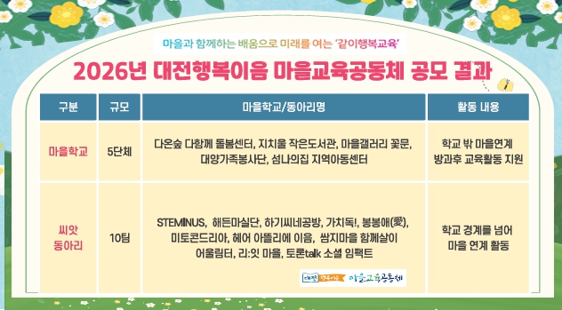 [파이낸셜경제=김영란 기자] 대전시교육청은 지역사회와 함께 성장하는 마을교육공동체 활성화를 위해 2026년 대전행복이음 마을학교와 씨앗동아리를 최종 선정했다고 밝혔다.