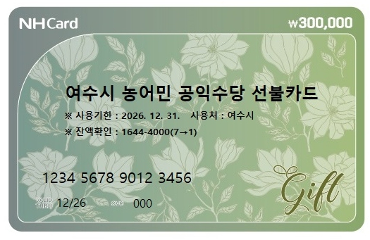 [파이낸셜경제=김예빈 기자] 여수시는 2026년부터 농어민 공익수당 지급방식을 기존 ‘여수사랑상품권(지류형)’에서 ‘선불카드’로 전환한다고 밝혔다.