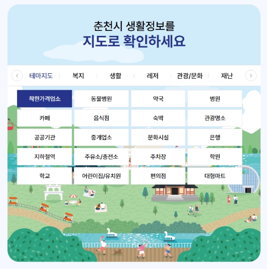춘천시 생활안내지도는 시민 생활에 도움이 될 수 있는 5개 분야(복지, 생활, 레저, 관광·문화, 재난)의 총 23종의 주제를 제공, 지난 2022년부터 다양한 행정정보를 지도 형태로 제공하는 플랫폼이다. 춘천시청 홈페이지 퀵메뉴 서비스를 통해 PC나 스마트폰으로 누구나 들어갈 수 있다. 인터넷에서 ‘춘천시 생활안내지도'를 검색하거나 춘천시청 홈페이지 퀵메뉴 서비스를 통해 PC나 스마트폰으로 누구나 들어갈 수 있다.