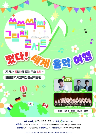 [파이낸셜경제=김기보 기자] 인천광역시교육청평생학습관은 5월 1일 인천 시민을 대상으로 ‘쓱쓱싹싹 그림책 콘서트, 떳다! 세계 음악 여행’ 공연을 개최한다.