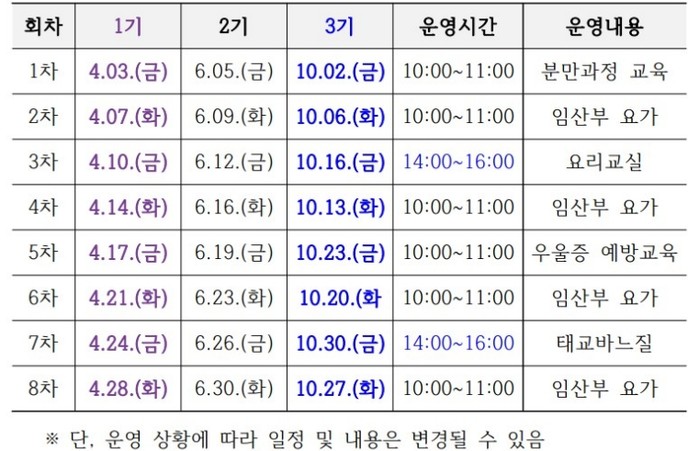 프로그램은 임산부 요가교실을 비롯해 분만 과정 이해, 이유식 만들기, 태교 바느질, 산전·산후 우울증 예방 교육 등 전문가 특강으로 구성된다.