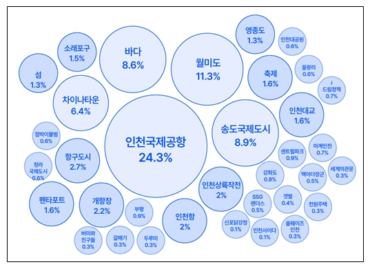 특히 인천 연상이미지는 ‘인천국제공항’(24.3%), ‘월미도’(11.3%), ‘송도국제도시’(8.9%), ‘바다’(8.6%) 등으로, 국제도시·공항도시, 해양·섬 관광도시 이미지를 확보했다는 점에서 의미 있는 성과로 평가된다.