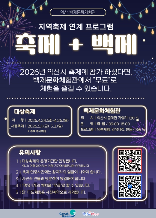 익산시 관계자는 "익산의 대표 축제를 찾은 방문객들이 보다 폭넓게 지역을 즐길 수 있도록 이벤트를 마련했다"며 "앞으로도 다양한 자원을 연계해 체류형 관광 콘텐츠를 지속 확대하겠다"고 말했다.