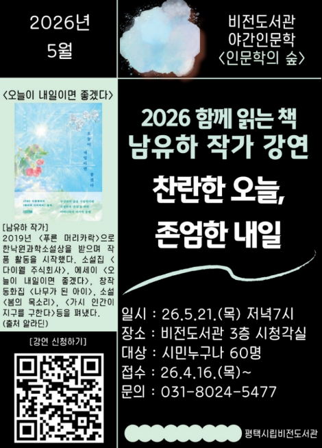 [파이낸셜경제=김기보 기자] 평택시립 비전도서관은 오는 5월 21일 저녁 7시 남유하 작가를 초청하여 ‘찬란한 오늘, 존엄한 내일’을 주제로 야간 인문학 강연을 진행한다.
