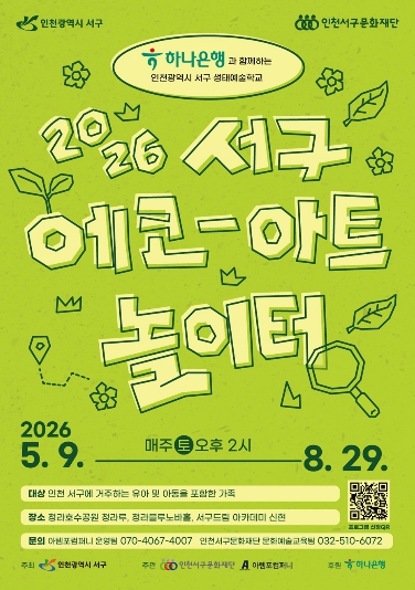 [파이낸셜경제=김기보 기자] (재)인천서구문화재단(대표이사 김성하)은 하나은행과 함께하는 2026년 ‘서구 에코-아트놀이터 시즌3’를 운영한다. 이는 도심 속 생태환경을 주제로 한 가족 참여형 문화예술교육 프로그램이다.