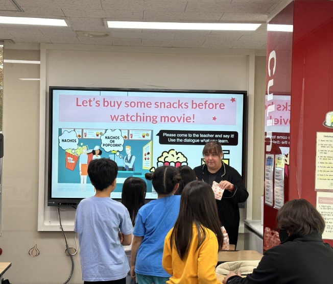 어학관 내부를 영화관처럼 꾸미고 팝콘 구매 시 사용하는 영어 표현을 직접 실습하는 등 학생들이 자연스럽게 영어를 익힐 수 있도록 구성했다.