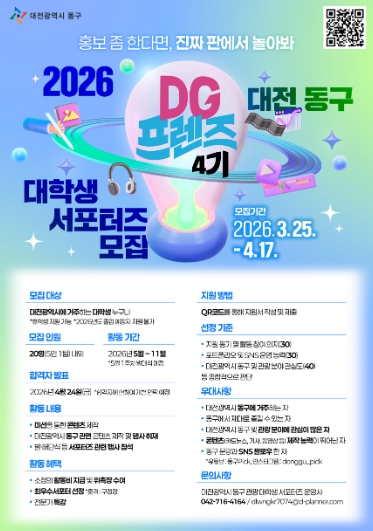 [파이낸셜경제=김영란 기자] 대전 동구는 오는 4월 17일까지 동구의 매력을 창의적인 콘텐츠로 알릴 대학생 관광서포터즈 ‘DG프렌즈 4기’를 공개 모집한다고 26일 밝혔다.