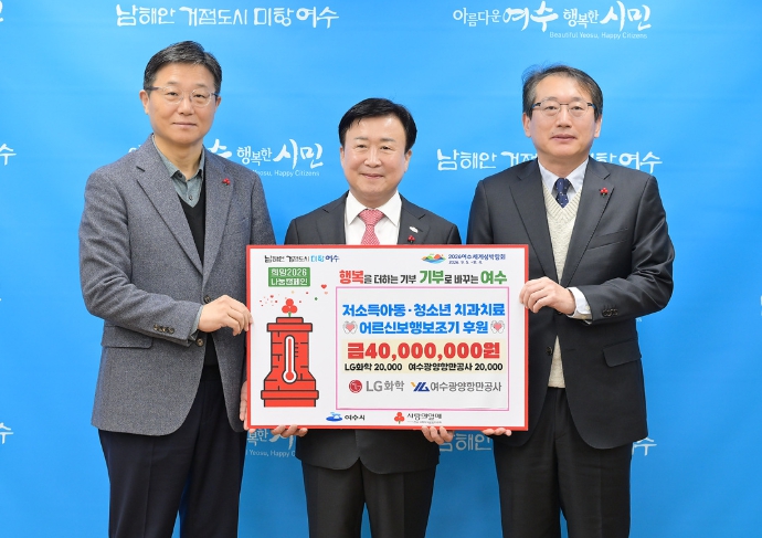 [파이낸셜경제=김예빈 기자] 여수시는 LG화학 여수공장(주재임원 이현규)과 여수광양항만공사(사장직무대행 황학범)가 지난 23일 저소득 아동·청소년 치과치료 지원사업과 노인 보행 보조기 지원사업 추진을 위해 2천만 원씩 총 4천만 원을 후원하는 증서를 전달했다고 밝혔다.