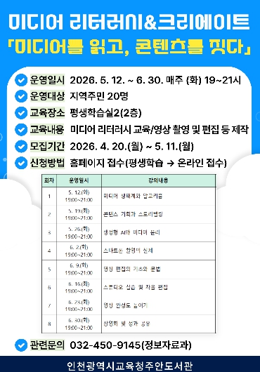 [파이낸셜경제=김기보 기자] 인천광역시교육청주안도서관은 시민의 디지털 역량 강화와 올바른 미디어 활용을 돕기 위해, 5월 12일부터 미디어 리터러시 교육 프로그램 ‘미디어를 읽고, 콘텐츠를 짓다’를 운영한다.