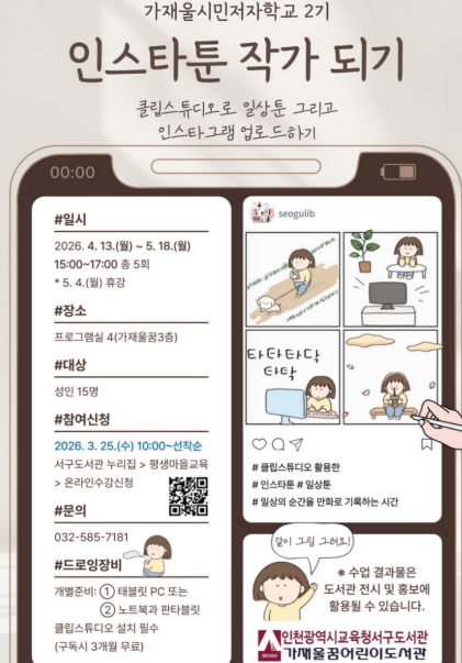 [파이낸셜경제=김기보 기자] 인천광역시교육청서구도서관은 지역 주민의 창작 활동을 지원하기 위해, 25일부터 가재울 시민저자학교 2기 프로그램인 ‘인스타툰 작가되기’ 참여자를 모집한다.