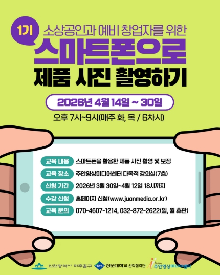 [파이낸셜경제=김기보 기자] 인천 미추홀구 주안영상미디어센터(센터장 장구보)는 지역 소상공인과 예비 창업자의 온라인 마케팅 경쟁력을 높이기 위해 ‘스마트폰으로 제품 사진 촬영하기’ 1기 교육 수강생을 모집한다고 밝혔다.