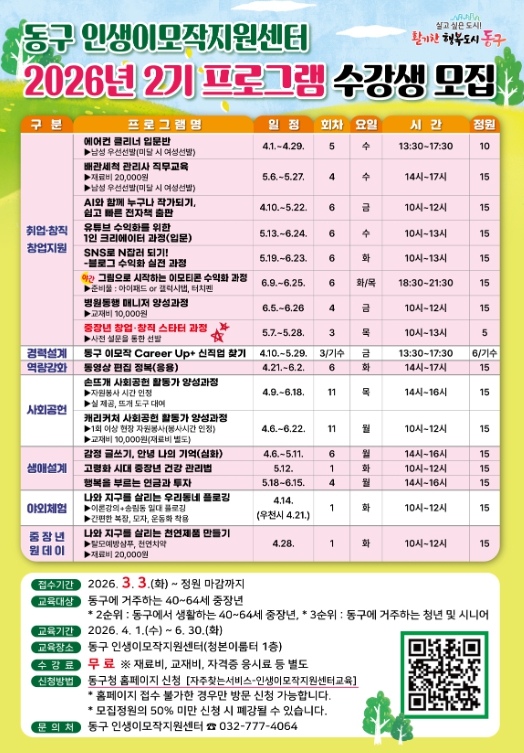교육은 2026년 4월 1일~6월 30일까지 진행되며, 동구에 거주하는 40세~64세까지의 중장년을 대상으로 동구 인생이모작지원센터 (청본이룸터 1층)에서 실시된다.