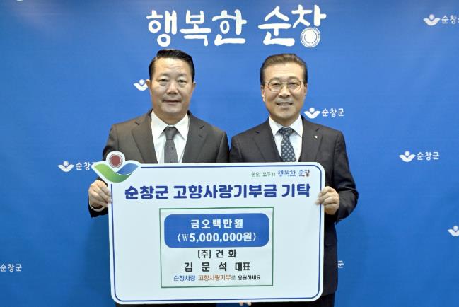 [파이낸셜경제=김예빈 기자] 순창군은 15일 ㈜건화 김문석 대표이사가 순창군에 고향사랑기부금 500만원을 기탁했다고 밝혔다.
