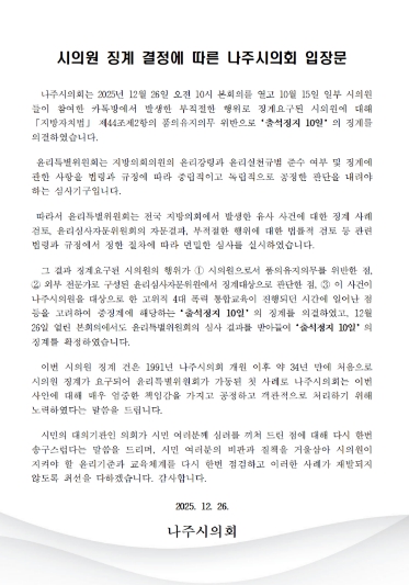 [파이낸셜경제=김예빈 기자] 나주시의회는 2025년 12월 26일 오전 10시 본회의를 열고, 10월 15일 일부 시의원들이 참여한 카톡방에서 발생한 부적절한 행위로 징계요구된 시의원에 대해 '지방자치법' 제44조제2항의 품의유지의무 위반으로 ‘출석정지 10일’의 징계를 의결하고 입장문을 발표했다.