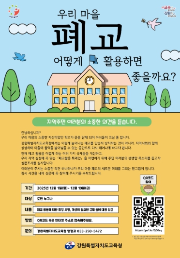 [파이낸셜경제=조성환 기자] 강원특별자치도교육청은 오는 12월 1일부터 12월 19일까지 폐교 재산의 효율적 활용을 위한 ‘폐교활용 특례안 마련 설문조사’를 실시한다고 밝혔다.