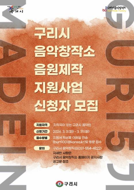 [파이낸셜경제=김기보 기자] 구리시는 3월부터 추진하는 구리시 음악창작소 지역 아마추어 음악가 음원 제작 지원사업 '2026 Made in Guri(메이드 인 구리)’참여자를 모집한다고 밝혔다.