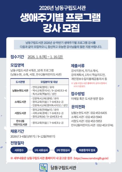 [파이낸셜경제=김기보 기자] 인천시 남동구 구립도서관은 3~12월까지 운영하는 ‘2026년 상·하반기 생애주기별 프로그램’에 함께 할 프로그램 강사를 공개 모집한다고 12일 밝혔다.