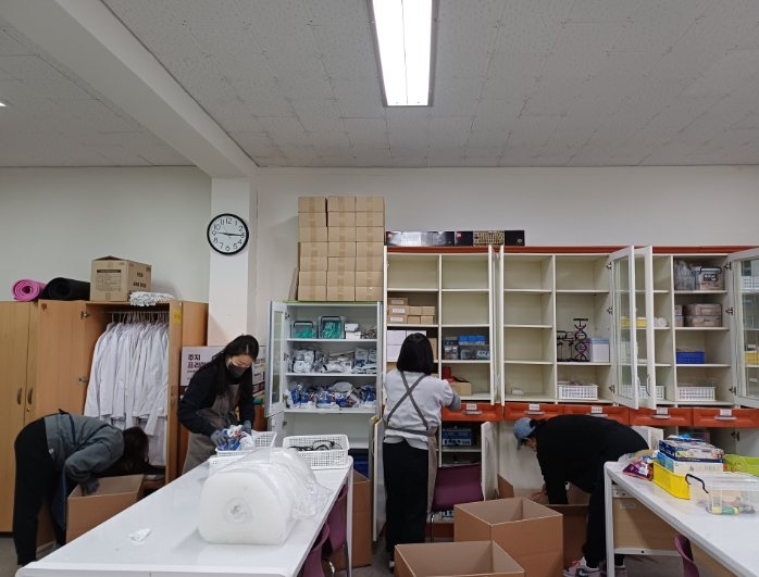 이날 지원에는 서산교육지원청 학교지원센터 특별실정리지원단 8명이 참여하여, 과학실에 비치된 각종 과학교구를 종류별로 분류하고, 공사 중 훼손이나 오염을 방지할 수 있도록 안전하게 포장하는 작업을 진행했다.