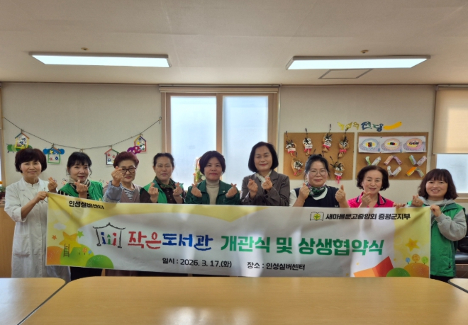 [파이낸셜경제=김기보 기자] 새마을문고중앙회 증평군지부(회장 강미영)가 17일 인성실버센터에서 ‘새마을문고 작은도서관’개관식과 상생 협약식을 개최했다.