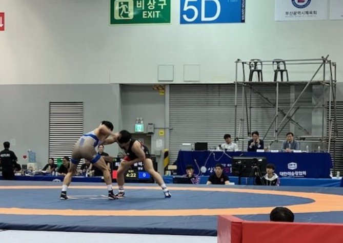 | ▲ 제106회 전국체육대회 레슬링 경기에서 정용석 선수(오른쪽)가 상대 선수와 치열한 경합을 벌이고 있다. |