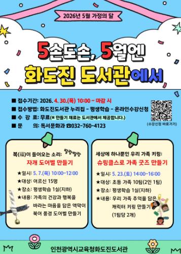 [파이낸셜경제=김기보 기자] 인천광역시교육청화도진도서관은 5월 가정의 달을 맞아 유·초등생 동반 가족과 어르신을 대상으로 세대 맞춤형 프로그램 ‘5손도손, 5월엔 화도진도서관에서’를 운영한다.