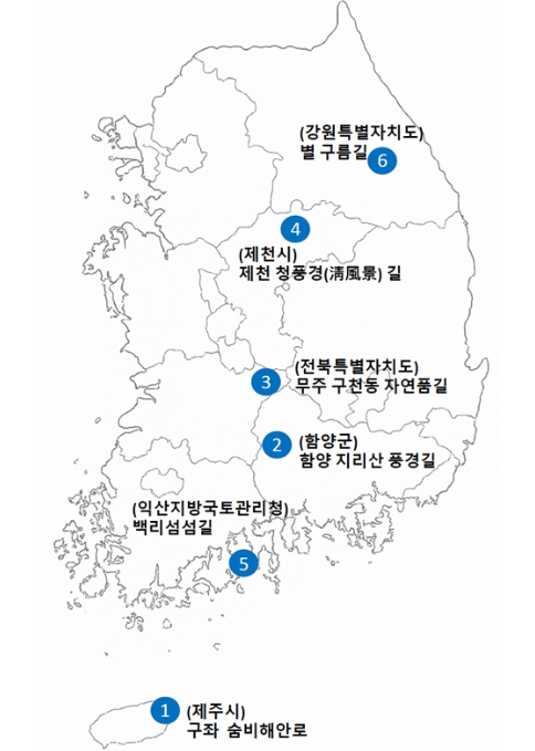 이번에 선정된 관광도로 6곳은 자연경관과 역사문화가 복합적으로 어우러진 “제주(구좌 숨비해안로), 경남(함양 지리산 풍경길), 전북(무주 구천동 자연품길), 충북(제천 청풍경길), 전남(백리섬섬길), 강원(별 구름길) 등 6개 노선으로,