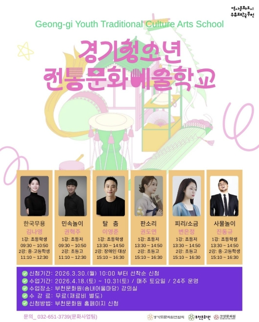 [파이낸셜경제=김기보 기자] 부천문화원은 청소년들의 전통문화 참여 기회를 확대하고 경기지역 전통민속예술의 지속 가능한 전승 기반 마련을 위한 ‘2026 경기청소년전통문화예술학교’ 참여 학생을 모집한다.