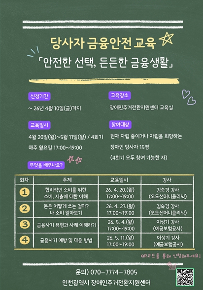 [파이낸셜경제=김기보 기자] 인천시사회서비스원 소속 인천시장애인주거전환지원센터는 당사자 금융 안전교육 ‘안전한 선택, 든든한 금융 생활’ 참가자를 모집한다고 6일 밝혔다.