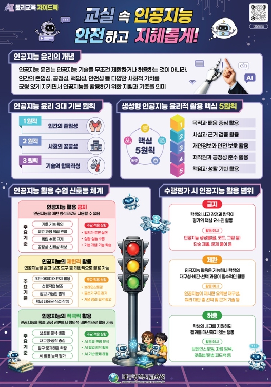 [파이낸셜경제=김지훈 기자] 대구시교육청은 인공지능(AI) 기술이 일상과 교육 전반에 빠르게 확산되는 환경 속에서, 학생들이 기술을 올바르고 책임 있게 활용할 수 있도록 지원하기 위해‘AI 윤리교육 가이드북’과 ‘범교과 SW·AI 디지털 시민윤리 교수∙학습자료’를 개발해 학교 현장에 보급한다.