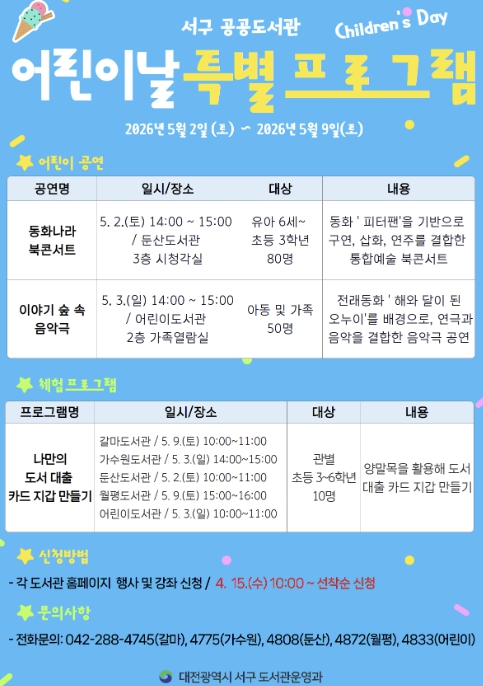 [파이낸셜경제=김영란 기자] 대전 서구 갈마·가수원·둔산·월평·어린이도서관은 내달 2일부터‘어린이날 특별 프로그램’을 운영한다.