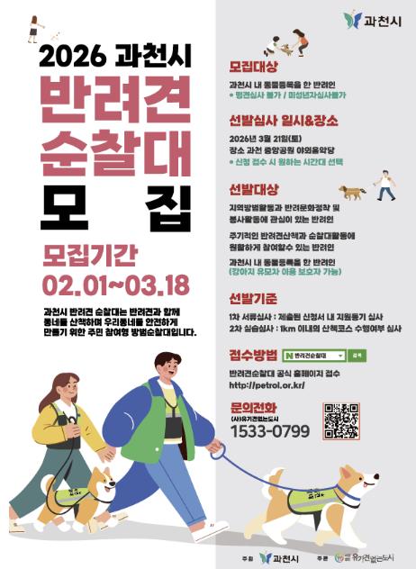 모집 대상은 동물등록된 반려견을 키우고 있는 과천 시민이며 강아지 유모차를 이용하는 보호자도 신청할 수 있다. 신청은 3월 18일까지 반려견순찰대 공식 누리집을 통해 가능하다.