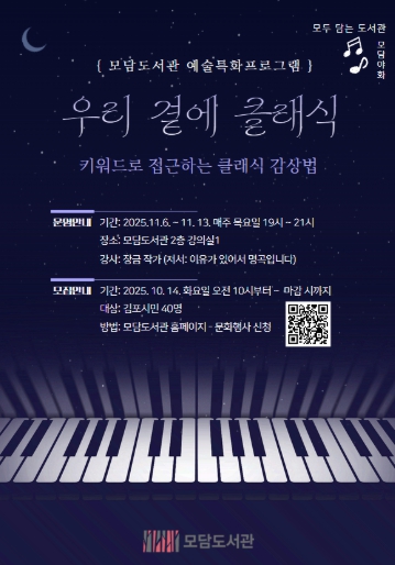 [파이낸셜경제=김기보 기자] 김포시 모담도서관은 클래식을 주제로 11월 6일부터 13일까지 매주 목요일 오후 7시부터 9시까지 특별 강연을 운영한다.