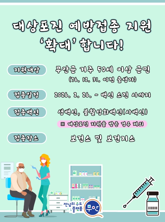 [파이낸셜경제=김예빈 기자] 무안군이 오는 23일부터 대상포진 예방접종 지원 대상을 확대한다.