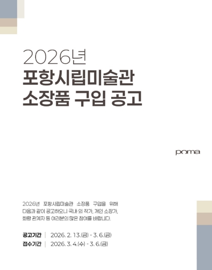 [파이낸셜경제=김지훈 기자] 포항시립미술관은 13일부터 내달 6일까지 ‘2026년 포항시립미술관 소장품 구입 공고’를 진행한다.