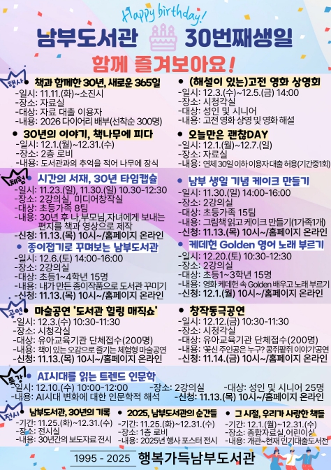 지난 30년간의 인기대출도서를 소개하는 ▲‘그 시절, 우리가 사랑한 책들’, 프로그램 포스터 전시 ▲‘2025, 남부도서관의 순간들’, 보도자료 속‘남부도서관 30년의 기록전’등 전시도 진행된다.