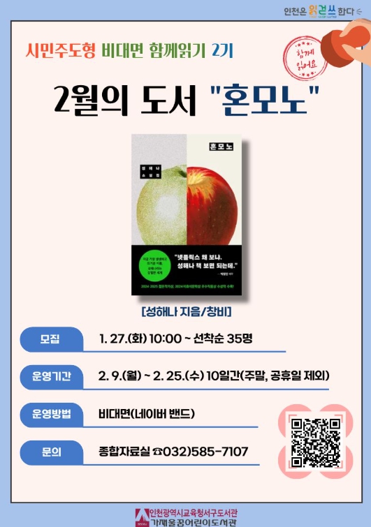 [파이낸셜경제=김기보 기자] 인천광역시교육청서구도서관은 ‘2026년 시민주도형 비대면 함께읽기’ 2기 프로그램으로, ‘혼모노’ 함께 읽기를 2월 9일부터 2월 25일까지 운영한다.