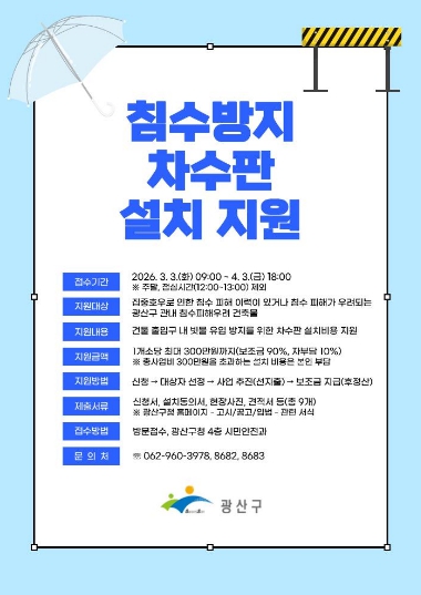 [파이낸셜경제=김예빈 기자] 광주 광산구가 집중호우로 인한 침수 피해 예방을 위해 ‘2026년 광산구 침수방지 차수판 설치 지원사업’을 추진한다.