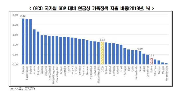 특히 우리나라의 현금성 가족정책 지출은 GDP 대비 0.32%로, OECD 38개국 중 34위로 최하위권에 머물러 있어 지출 증대의 필요성이 제기되고 있다.