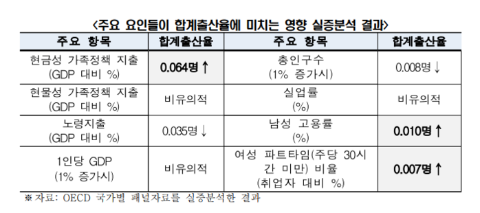 보고서는 가족정책 지출이 출산율에 미치는 영향을 분석하기 위해 패널회귀모형을 기반으로 하는 실증분석을 수행한 결과, 현금성 가족정책 지출이 GDP 대비 1% 포인트 증가하면 출산율은 약 0.064명 유의적으로 증가하는 것으로 분석됐다.