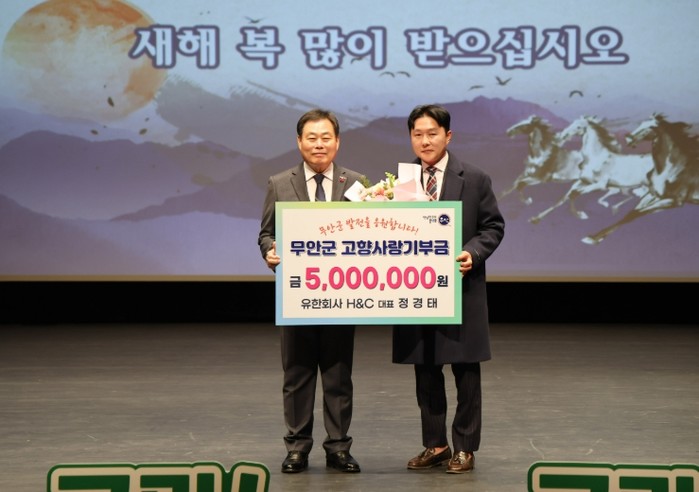 [파이낸셜경제=김예빈 기자] 무안군은 지난 5일 향우 기업인 유한회사 H·C 정경태 대표가 2026년 무안군 고향사랑기부제 제1호 기부자로 나서 500만 원을 기탁했다고 밝혔다.