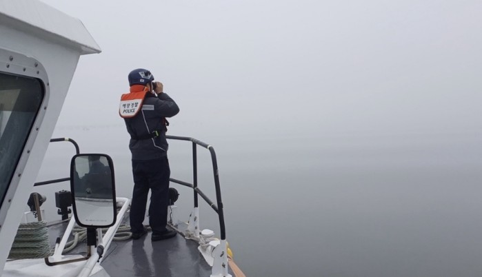 | ▲ 짙은 농무 속 해상 수색 중인 완도해경의 모습 |