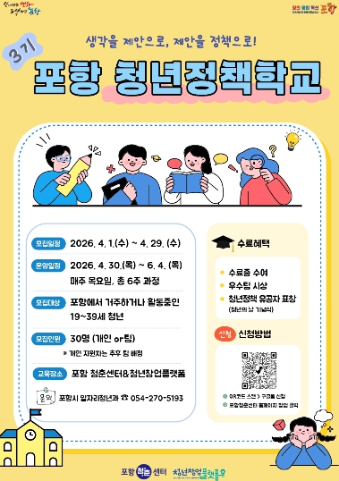 [파이낸셜경제=김지훈 기자] 포항시가 오는 4월 29일까지 ‘2026년 포항 청년정책학교’ 참여자를 모집한다.