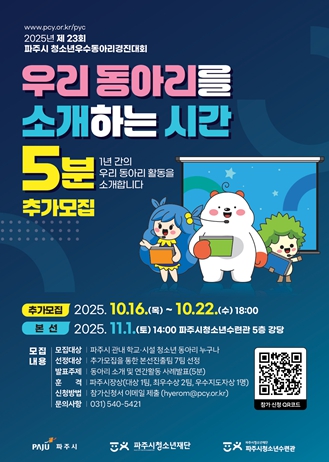 [파이낸셜경제=김기보 기자] (재)파주시청소년재단 파주시청소년수련관은 오는 10월 16일부터 10월 22일까지 “제23회 파주시 청소년우수동아리경진대회”의 참가 동아리를 모집한다.