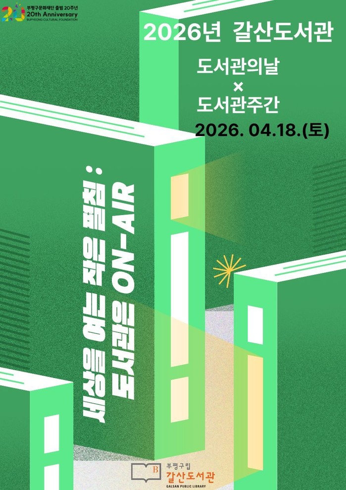 [파이낸셜경제=김기보 기자] 부평구립 갈산도서관은 2026년 도서관의 날·도서관 주간을 맞아 4월 한 달간 ‘세상을 여는 작은 펼침: 도서관은 ON-AIR’를 운영한다고 밝혔다.