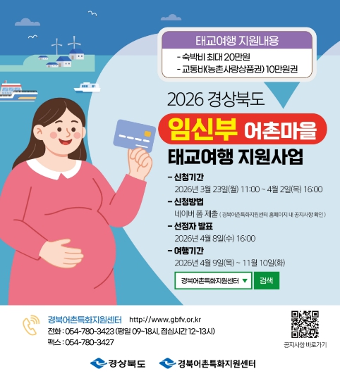 문성준 해양수산국장은 “경상북도 내 예비맘들이 아기와 함께 어촌마을로 여행 와서 소중하고 뜻깊은 여행을 하시기 바라며, 모든 임신부들의 건강한 출산을 기원한다.”고 말했다.