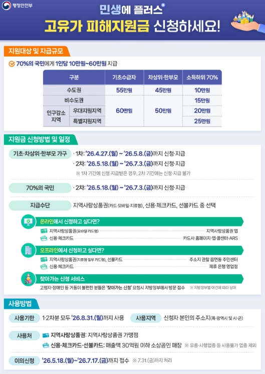 1차는 4월 27일부터 5월 8일까지로 기초생활수급자와 차상위·한부모 가구를 대상으로 우선 지급되며, 2차는 5월 18일부터 7월 3일까지로 1차 미신청자와 일반 대상자가 신청할 수 있다.